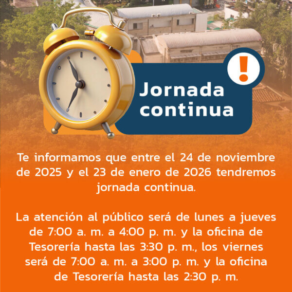 Tesorería: Lunes a Viernes de 7:00 a.m. a 12:00 p.m. y de 1:00 p.m. a 4:30 p.m.